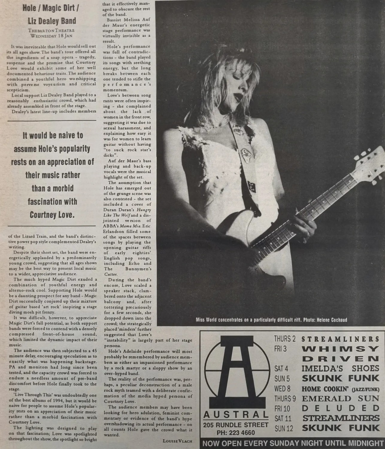 Hole Lineup: Courtney Love (Guitar/Vocals), Eric Erlandson (Guitar), Melissa Auf der Maur (Bass/Background Vocals), and Patty Schemel (Drums).