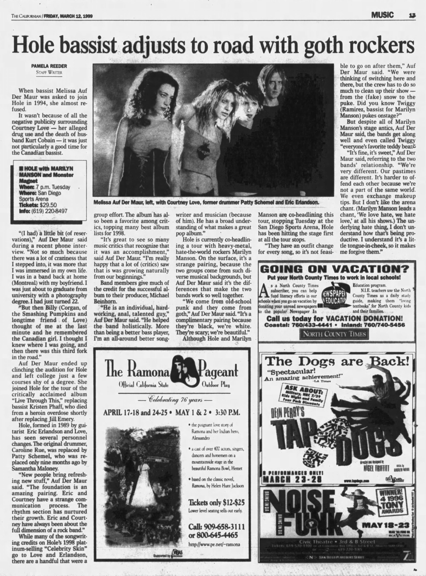 Hole Lineup: Courtney Love (Guitar/Vocals), Eric Erlandson (Guitar), Melissa Auf der Maur (Bass/Background Vocals), and Samantha Maloney (Drums).