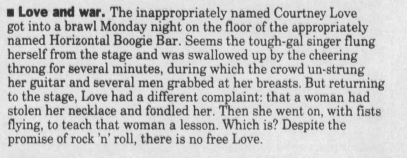• Courtney stage dived at the end of the night. When she got back on stage, she accused a woman in the audience of stealing her necklace and fondling her genitals. Along with some bouncers, Courtney followed the woman to an area to the right of the stage. The fight continued until the bouncers put an end to it.