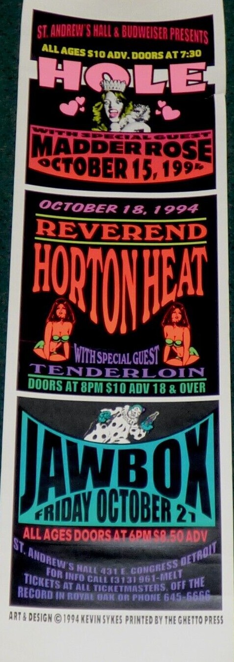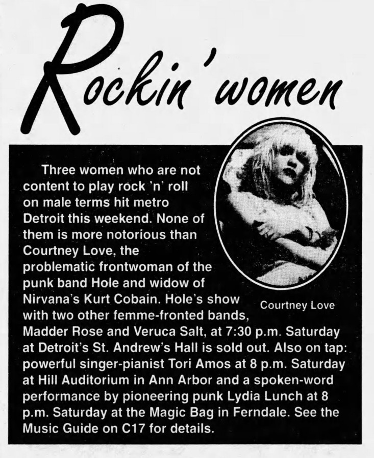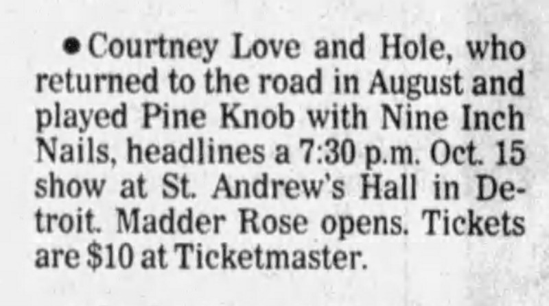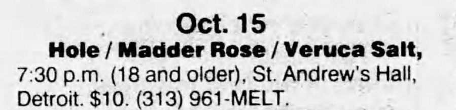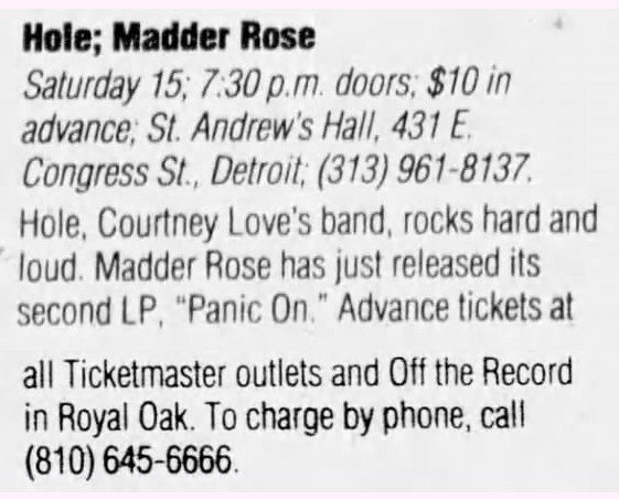 Other Bands: Hole had been scheduled to play at St. Andrew’s Hall on May 19, 1994, but the show was cancelled due to the death of Kurt Cobain.