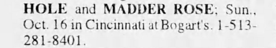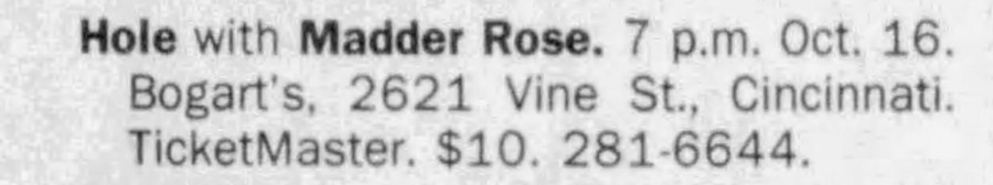 • Hole had been scheduled to play at Bogart’s on May 22, 1994, but the show was cancelled due to the death of Kurt Cobain.