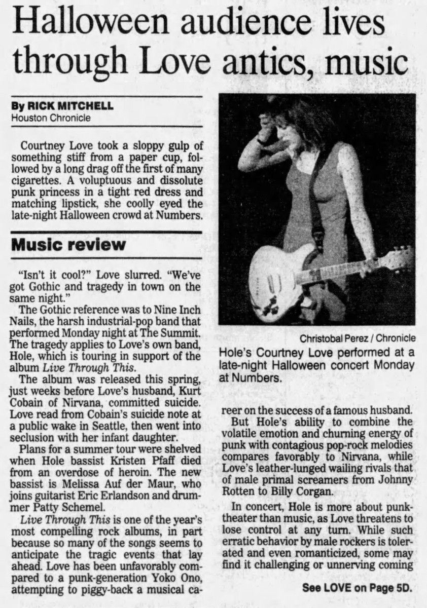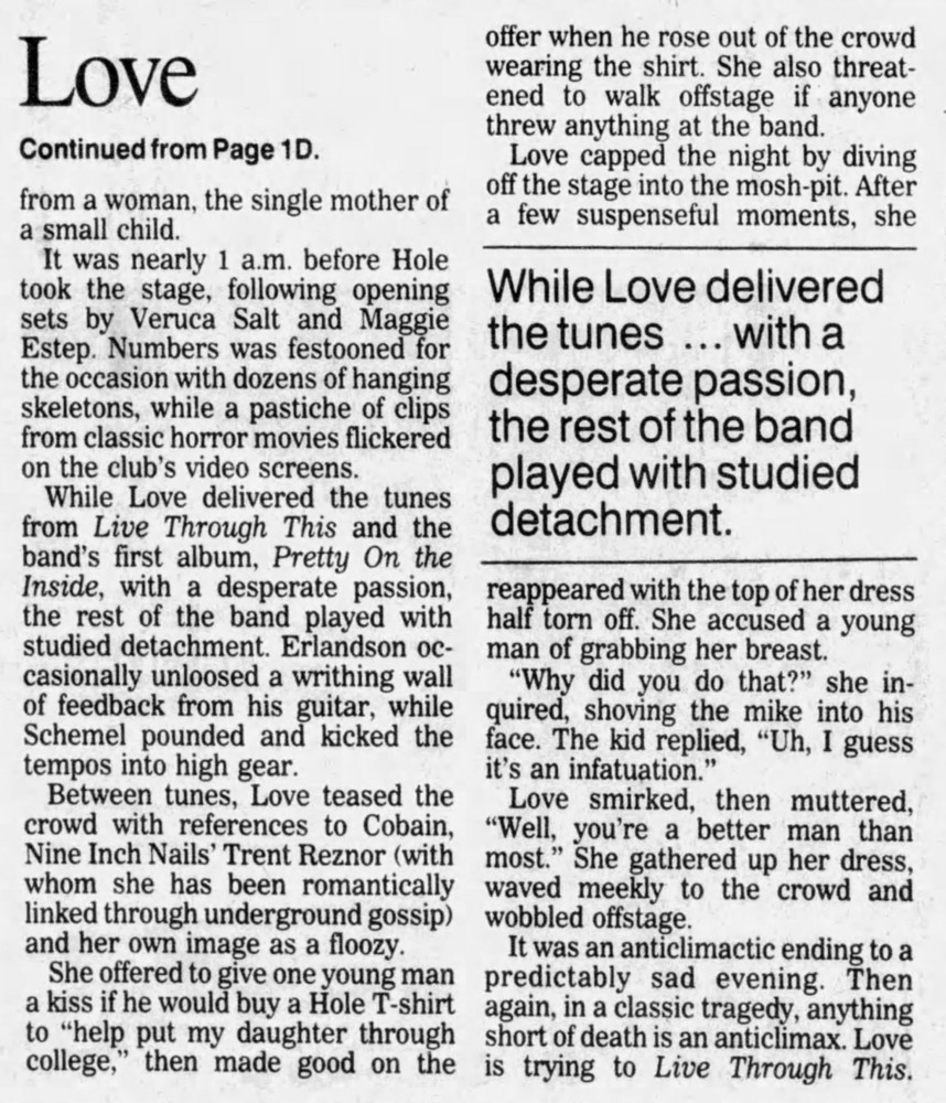 • At the end of the night, Courtney stage dived and had the top of her dress torn off. She accused a man in the audience of grabbing her breast. She asked him why he did it and he said, “I guess it’s an infatuation.”