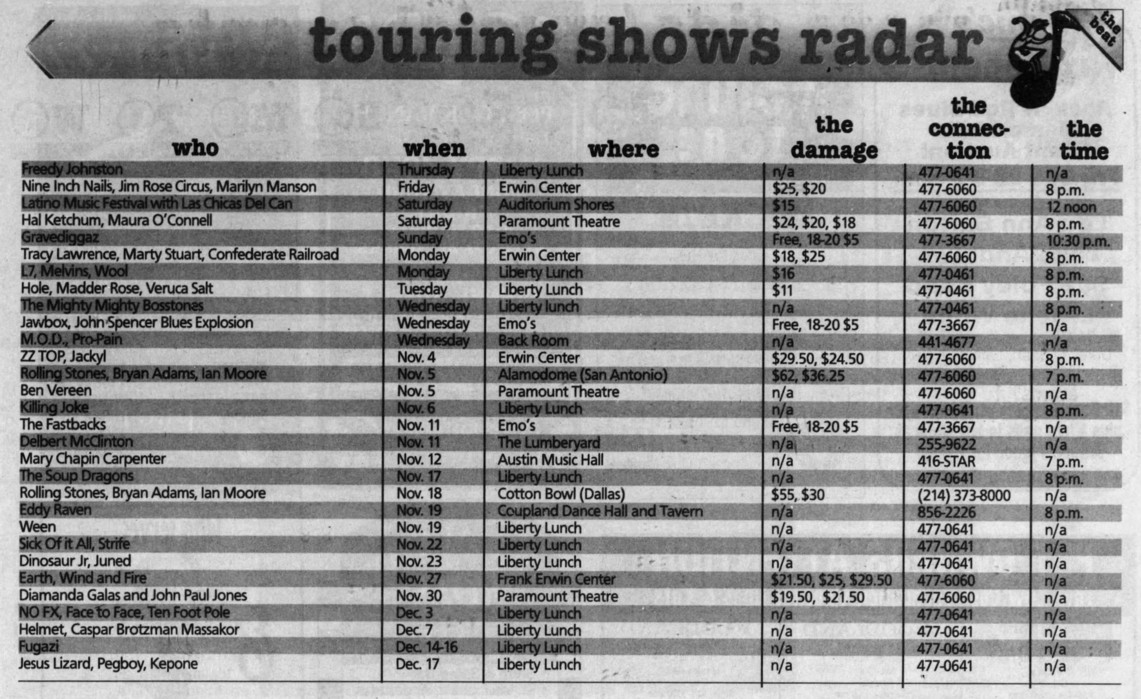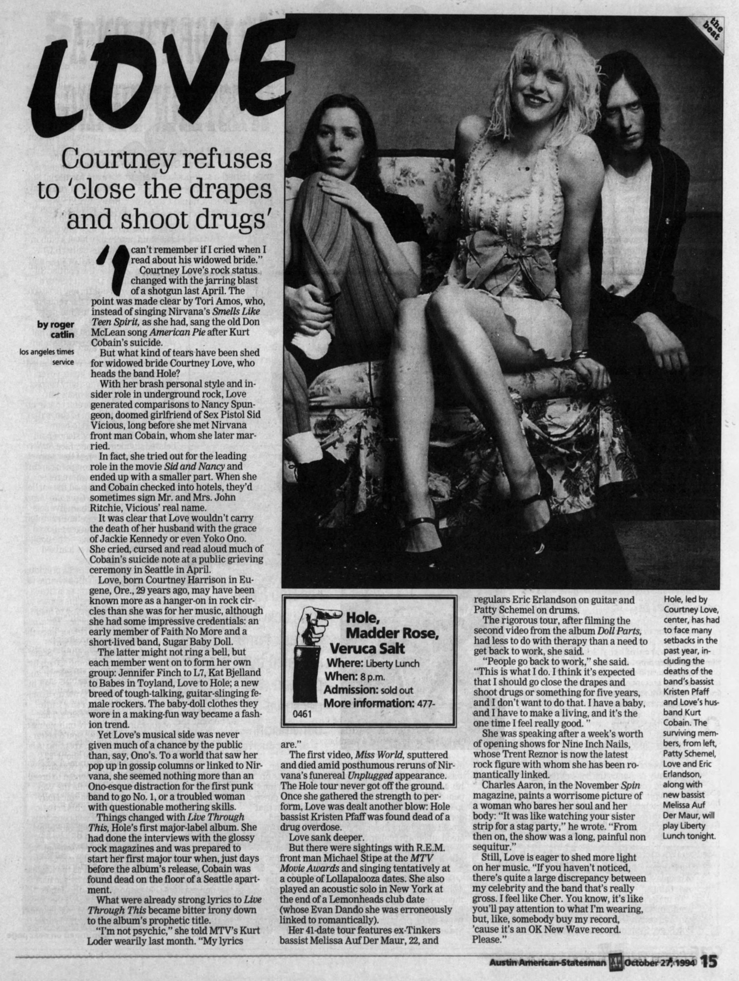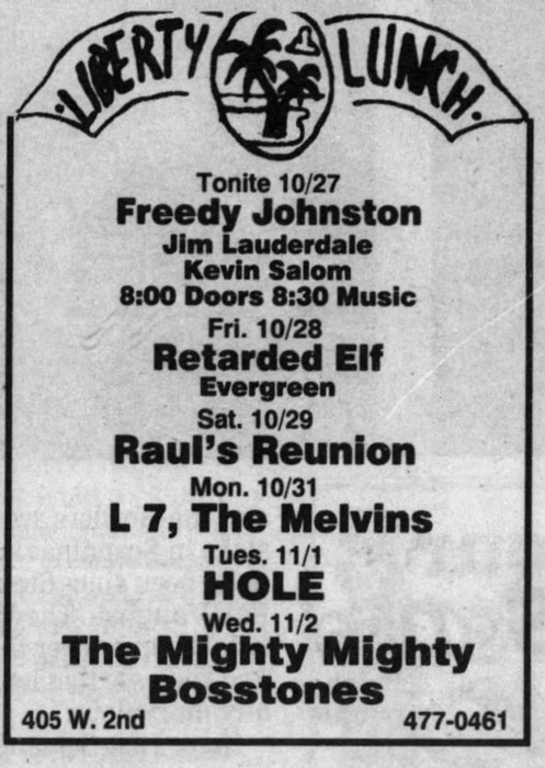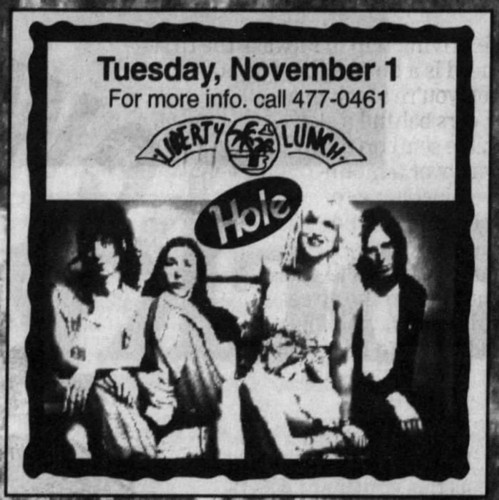 • Hole had been scheduled to play at Liberty Lunch on May 28, 1994, but the show was cancelled due to the death of Kurt Cobain.