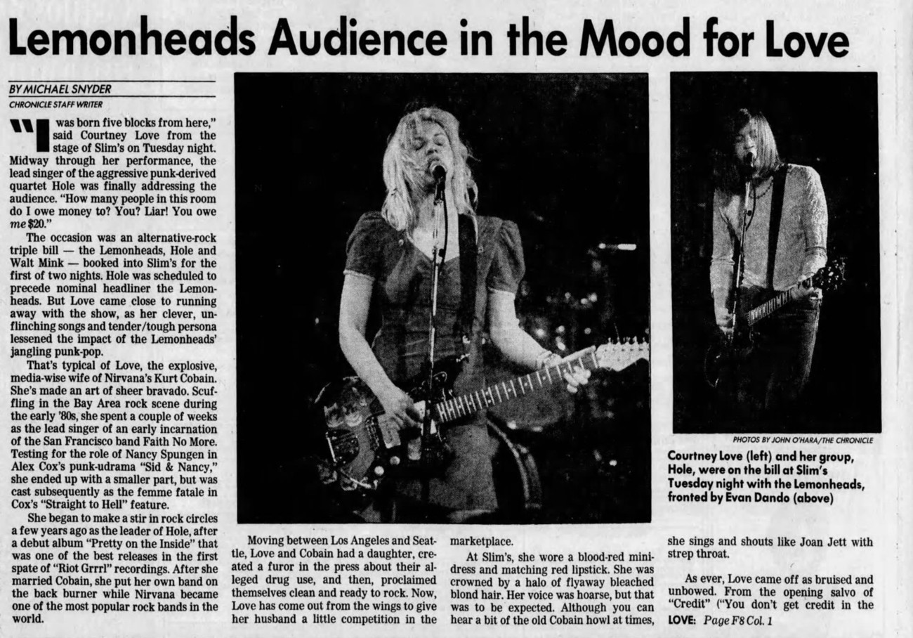 Hole Lineup: Courtney Love (Guitar/Vocals), Eric Erlandson (Guitar), Kristen Pfaff (Bass/Background Vocals), and Patty Schemel (Drums).