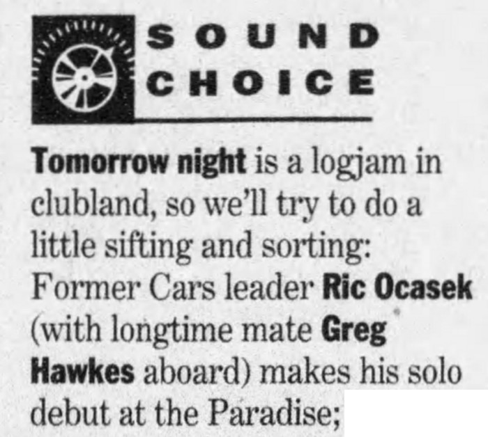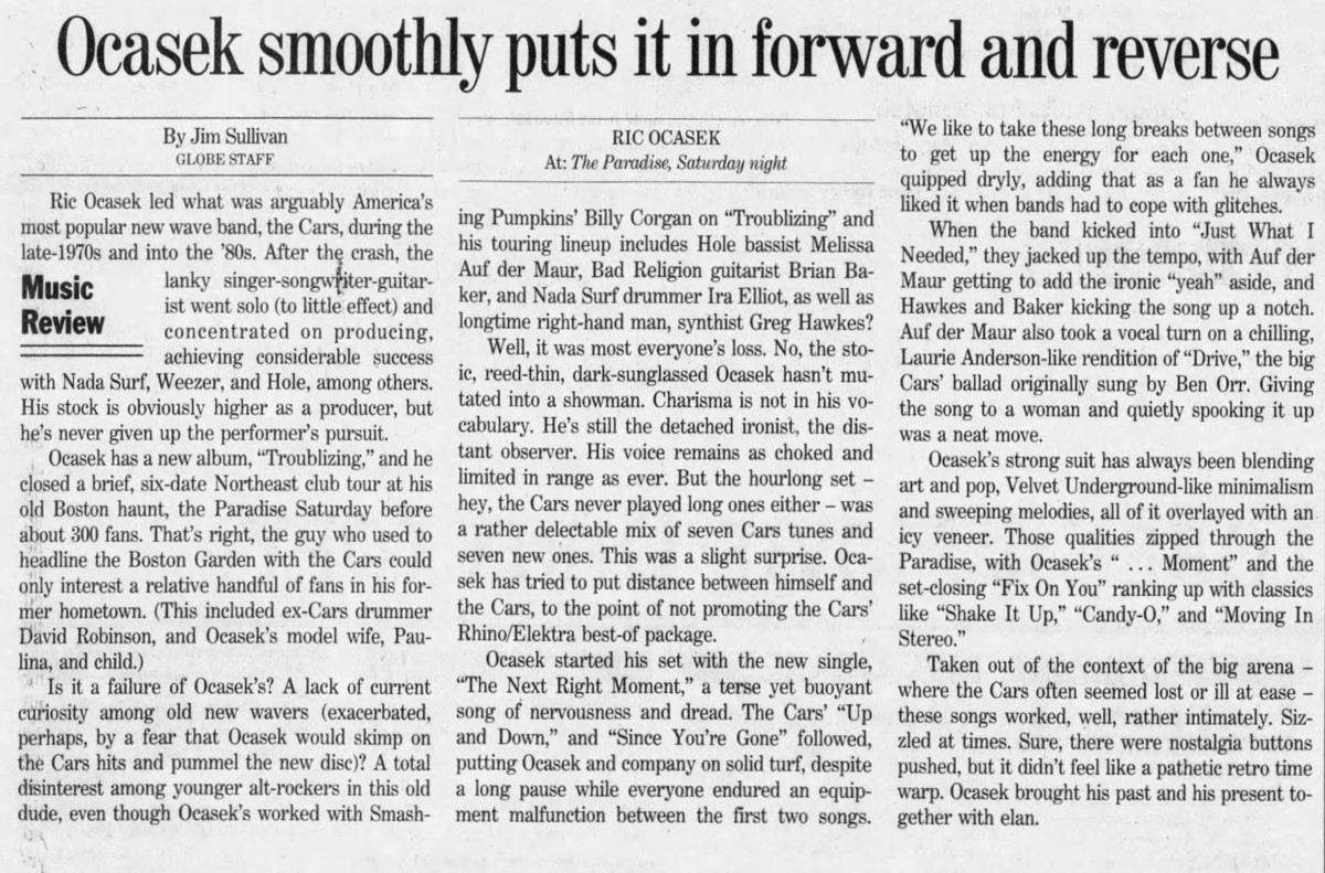 • There were 300 people in the audience, including David Robinson (Cars’ drummer) and Paulina Porizkova (Ocasek’s wife).