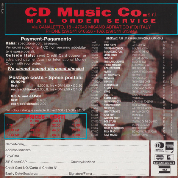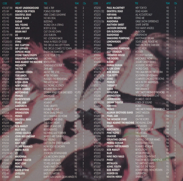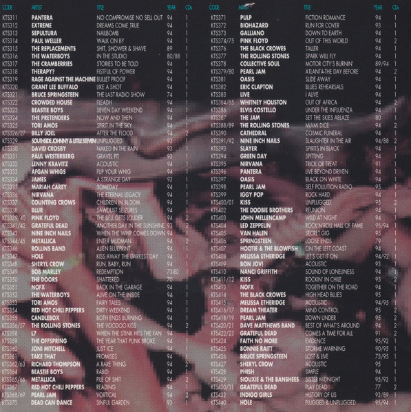• The photos on the front cover are from 12-05-1994 and MTV Unplugged. The photos on the sleeves are from 10-02-1994 at the Masquerade, 01-22-1995 at the Big Day Out, 08-29-1994 at Nautica Stage, 08-26-1994 at the Reading Festival, and MTV Unplugged. The photo on the back cover is from 07-15-1991 at CBGB.